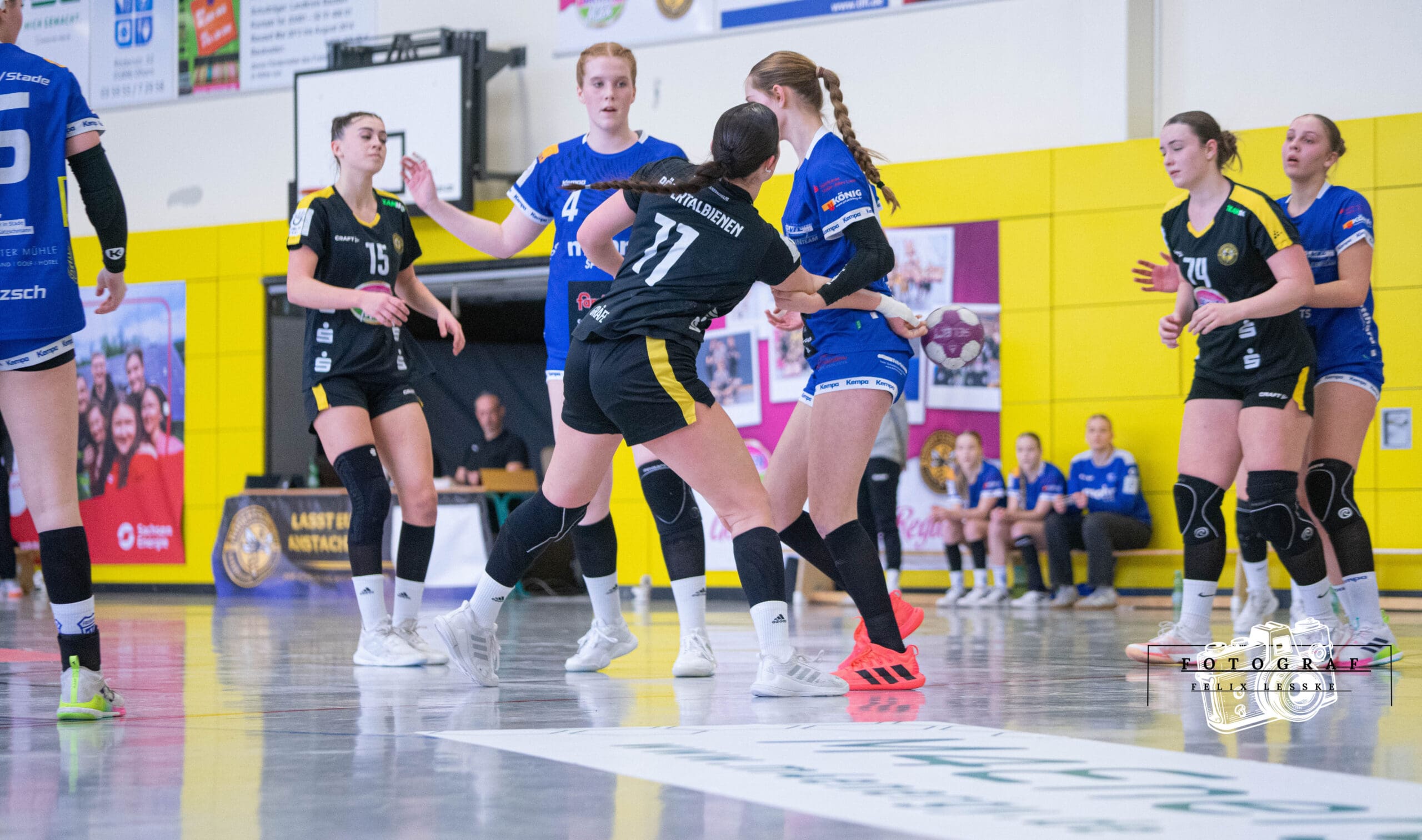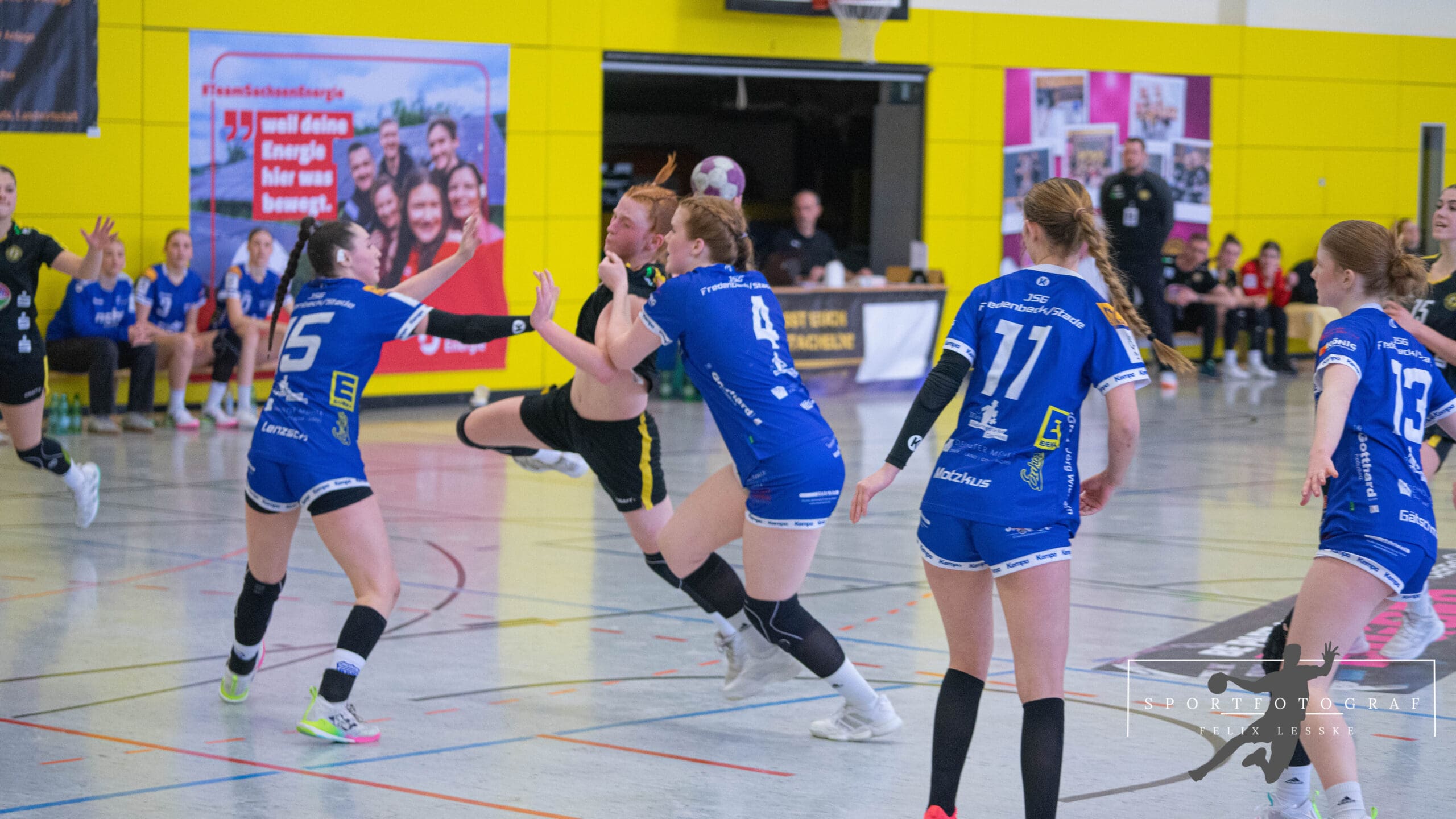 Dennoch starteten die Bienen stark in die Partie und erspielten sich früh eine Führung (2:5). Mit hohem Tempo versuchte das Team, die gegnerische Defensive in Bewegung zu bringen, ließ dabei jedoch einige Chancen ungenutzt. Dies ermöglichte Fredenbeck, ins Spiel zu finden und den Ausgleich (6:6) zu erzielen. Besonders die kompakte 6:0-Deckung der Gastgeberinnen bereitete dem Rödertaler Angriff zunehmend Schwierigkeiten. Die JSG nutzte ihre Chancen konsequent und drehte das Spiel noch vor der Pause (13:12).